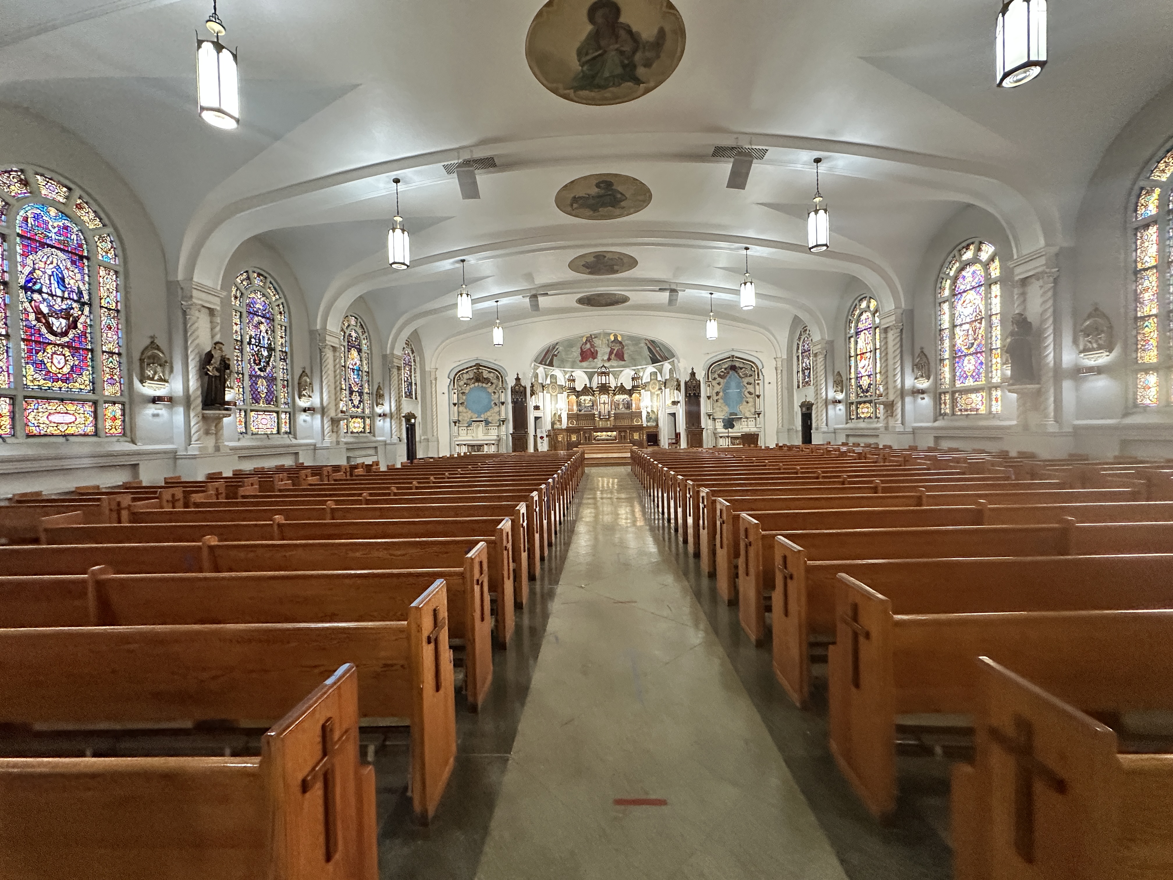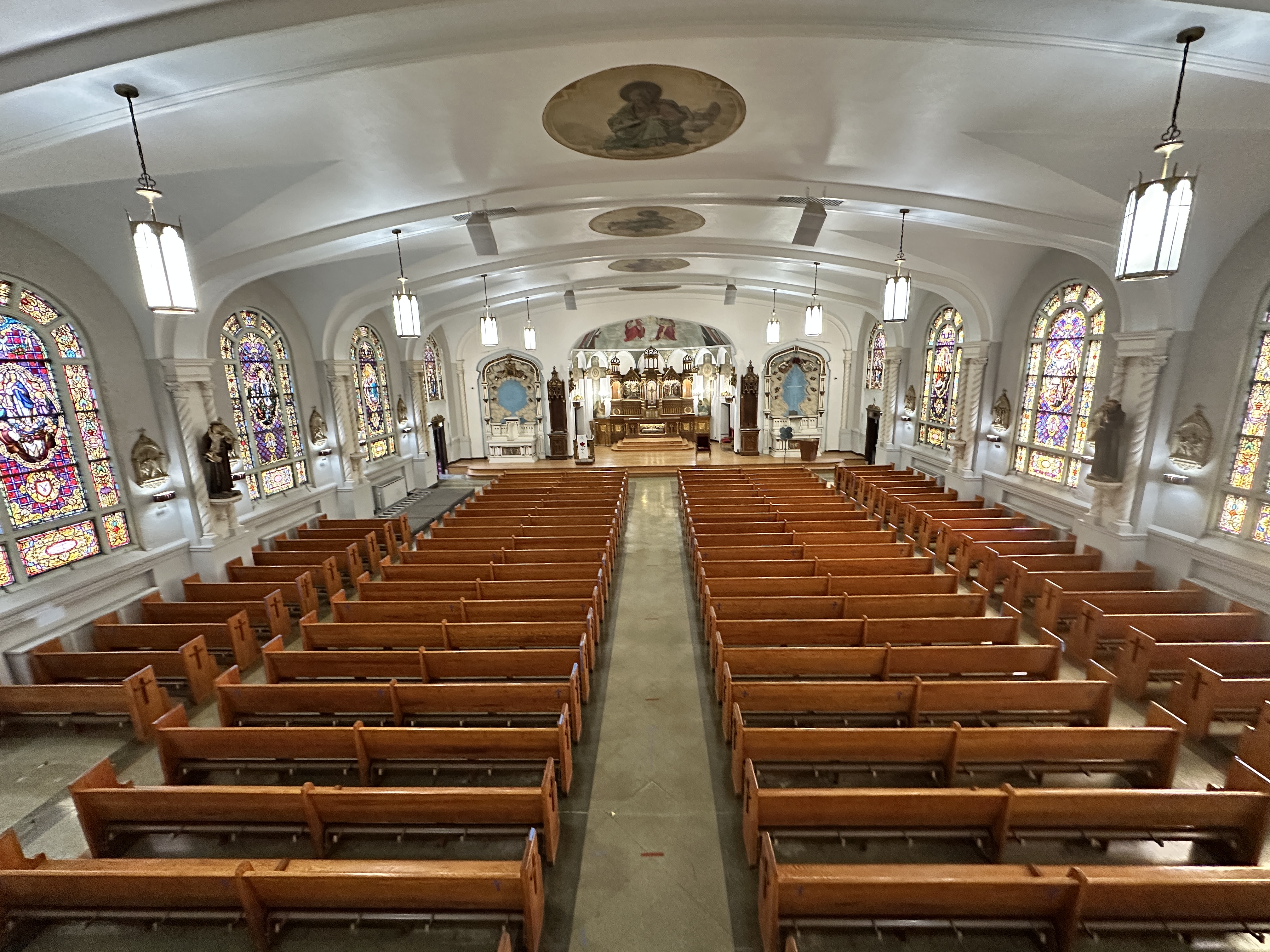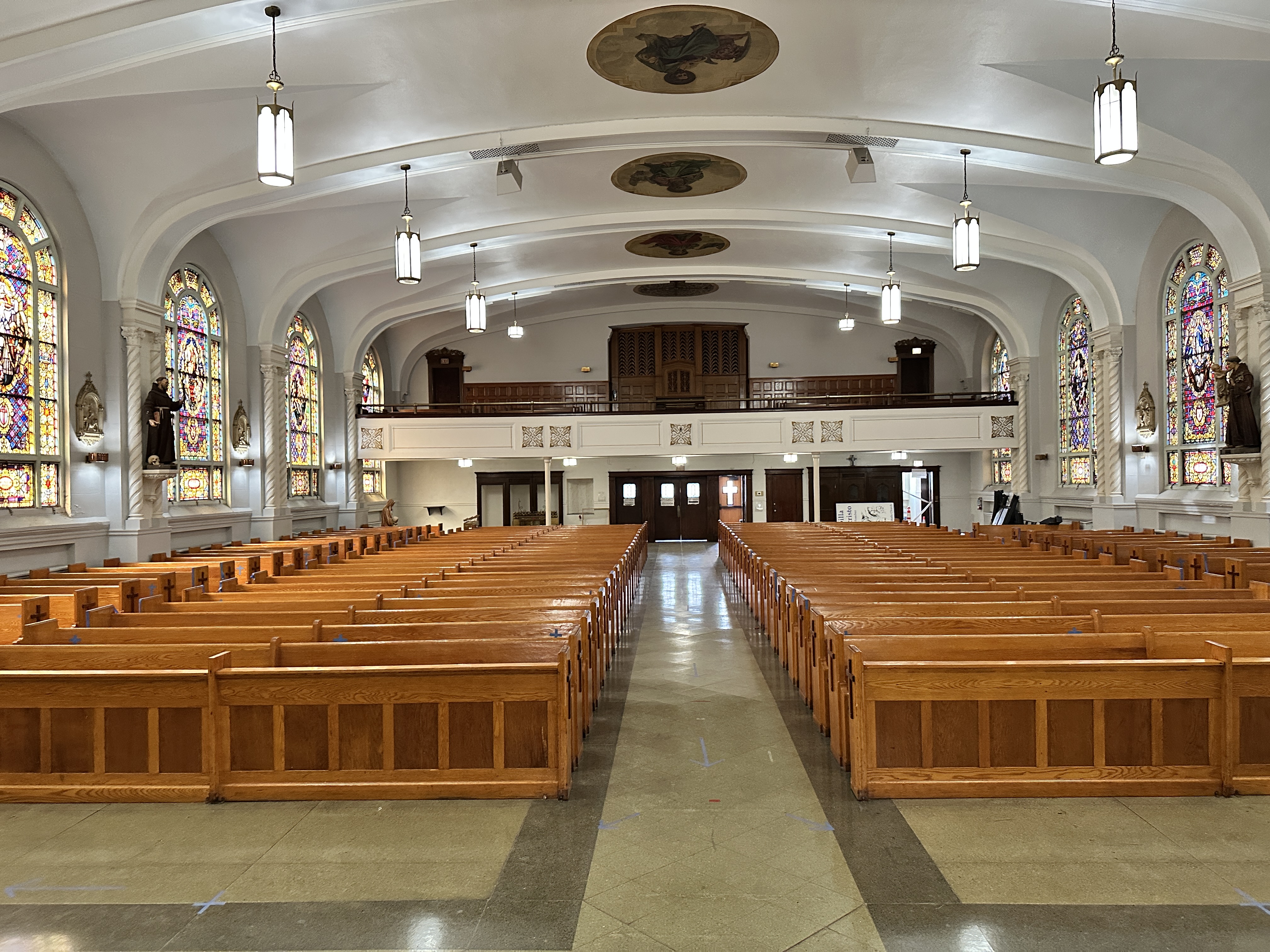 • The sanctuary can seat 675±. There is a Parish Hall with a stage that can seat 150± and a kitchen.