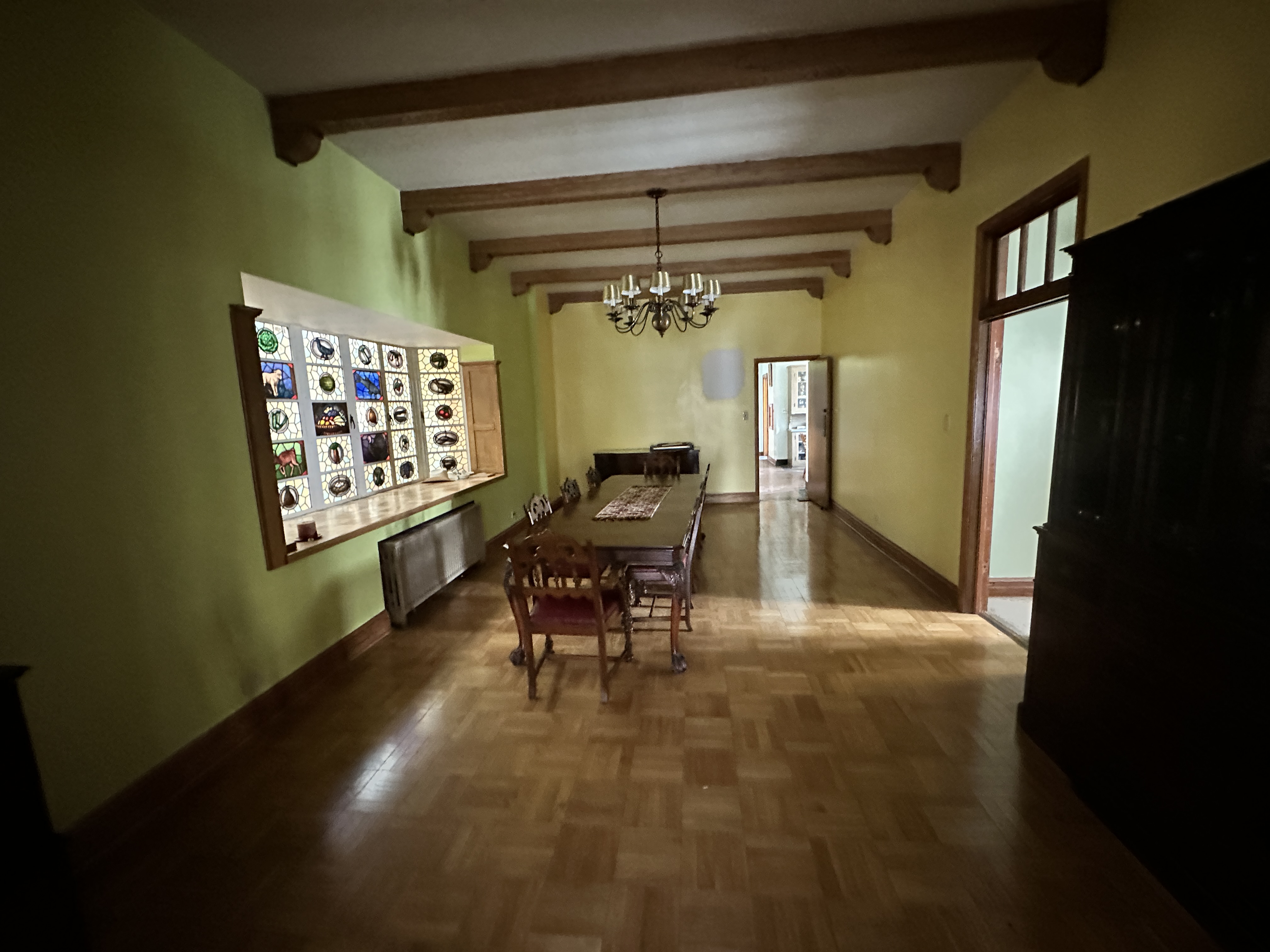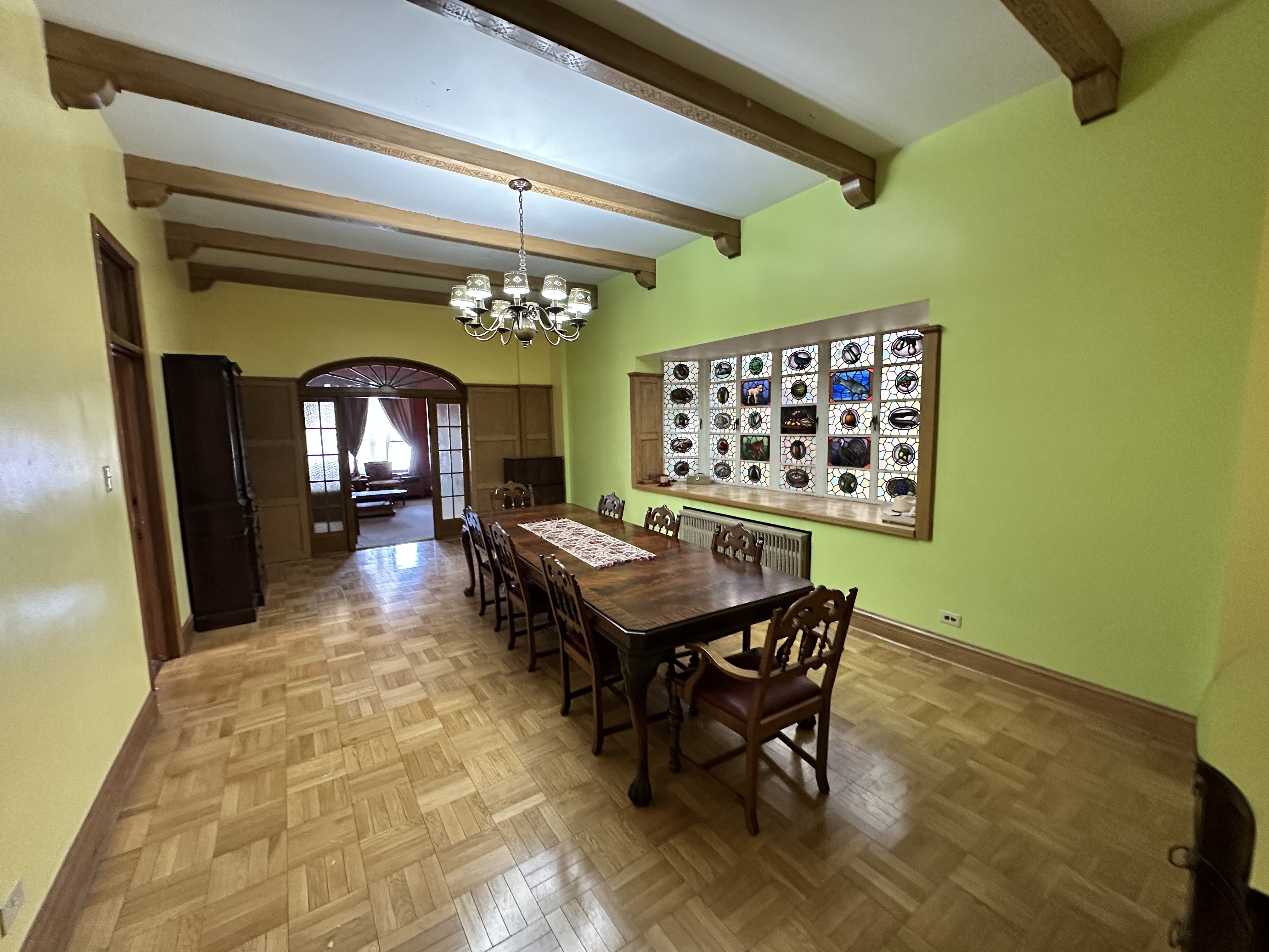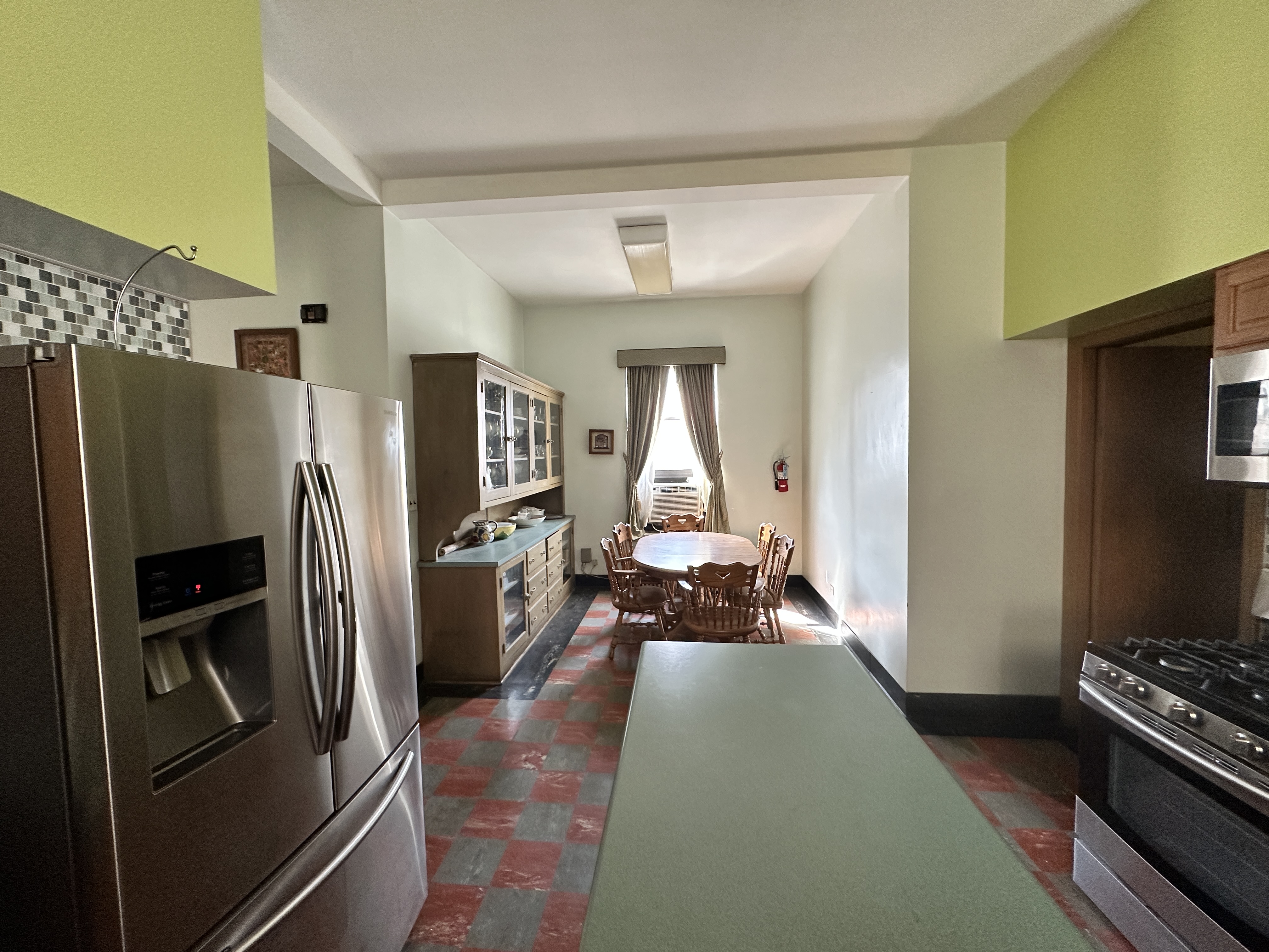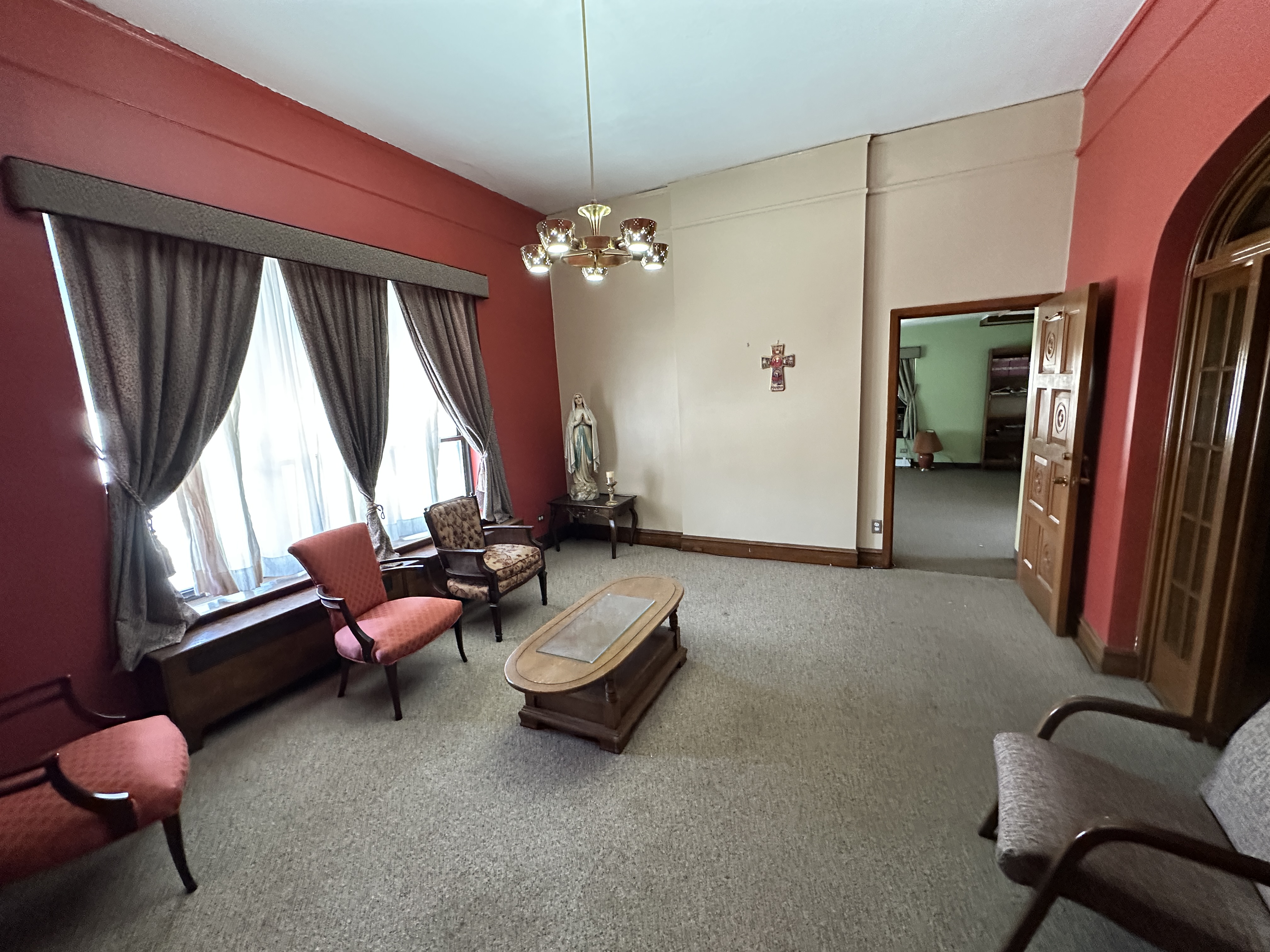 • The first floor of the rectory has a receiving room, a kitchen with a small eating area, a living room and a dining room plus a large bedroom with a bathroom. The 2nd floor has 8 bedrooms with multiple shared bathrooms. The lower level has two offices.