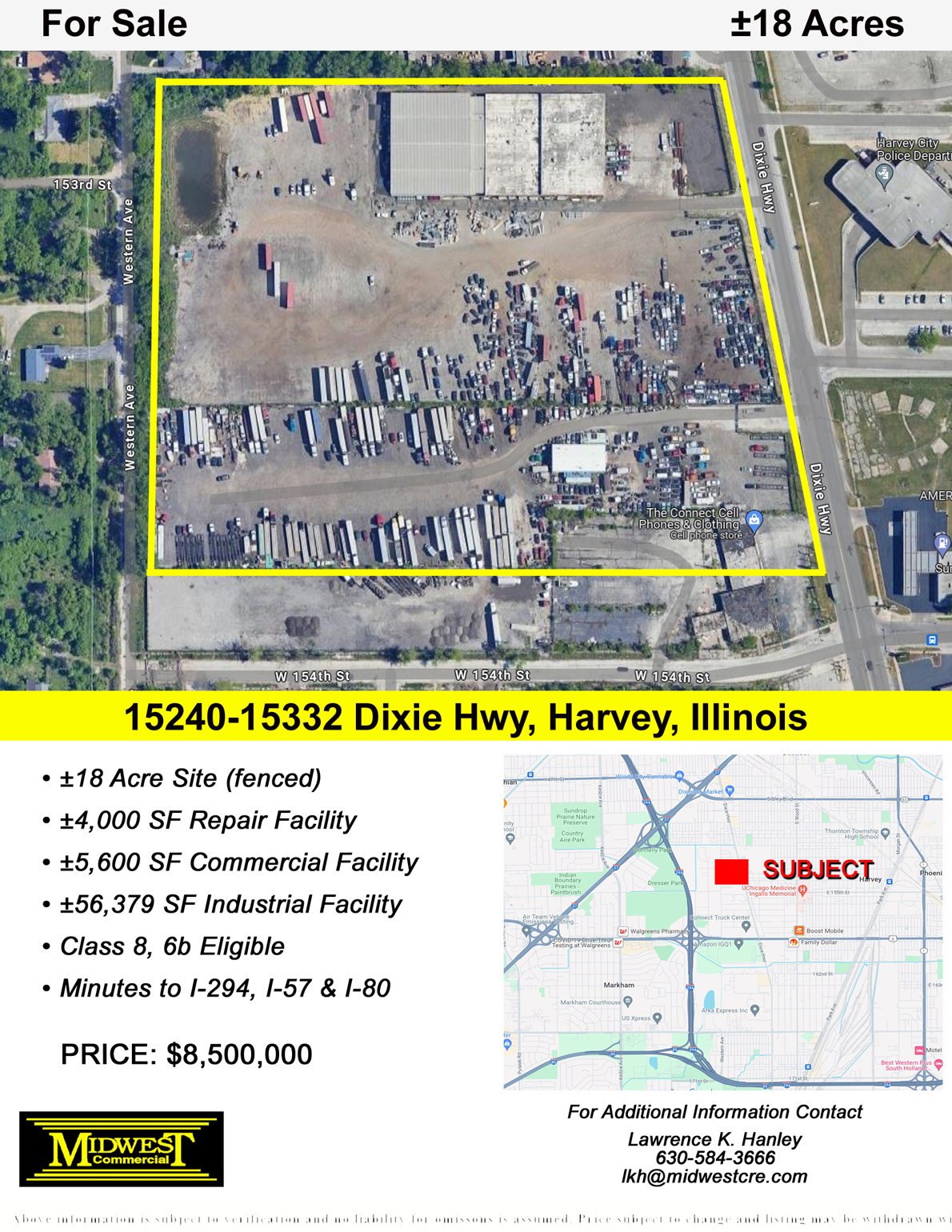 ±18-Acre Site (fenced) ±4,000 SF Repair Facility±5 , 600 SF Commercial Facility ±56,379 SF Industrial FacilityClass 8, 6b EligibleMinutes to I-294, I-57 & I-80